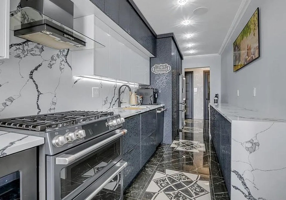 - Quartz countertops and waterfall backsplash for a sleek, contemporary look.
