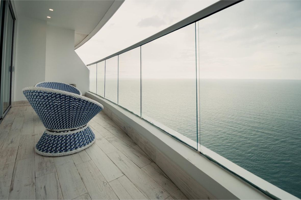 Siéntase suspendido sobre el mar desde su balcón con barandas de vidrio.