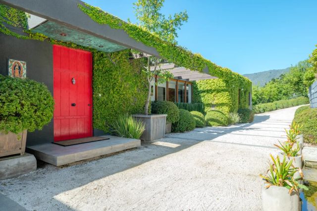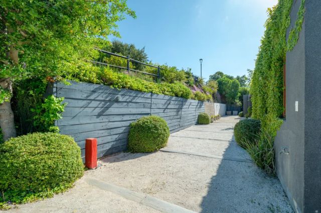 The house features several parking spaces, a landscaped garden, and access from both the upper and lower parts of the house.