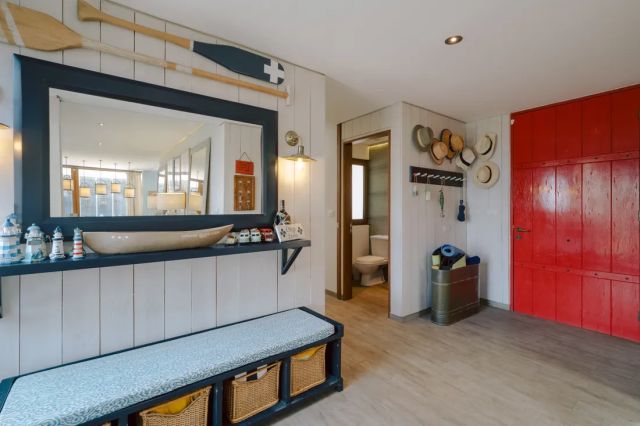 Distribution: On the upper level, the common areas are found, highlighting a spectacular and spacious living-dining room, with access to a closed barbecue area and an outdoor terrace. A large fully equipped kitchen connects to the dining room through folding doors and has access to a laundry area and a service room.