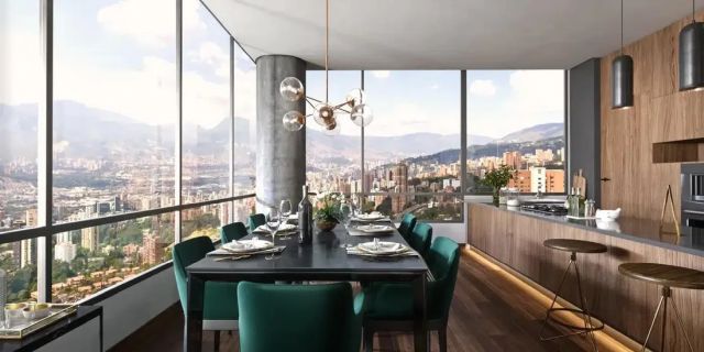 Encompassing approximately 318 square meters (3,423 sq ft), this singular home occupies an entire floor, ensuring complete privacy with no shared walls and direct access via a private elevator. The soaring 3-meter ceilings and floor-to-ceiling windows flood the interiors with natural light, framing breathtaking views that extend across the Aburrá Valley, the lush hills of El Poblado, and the skyline of Medellín itself.
