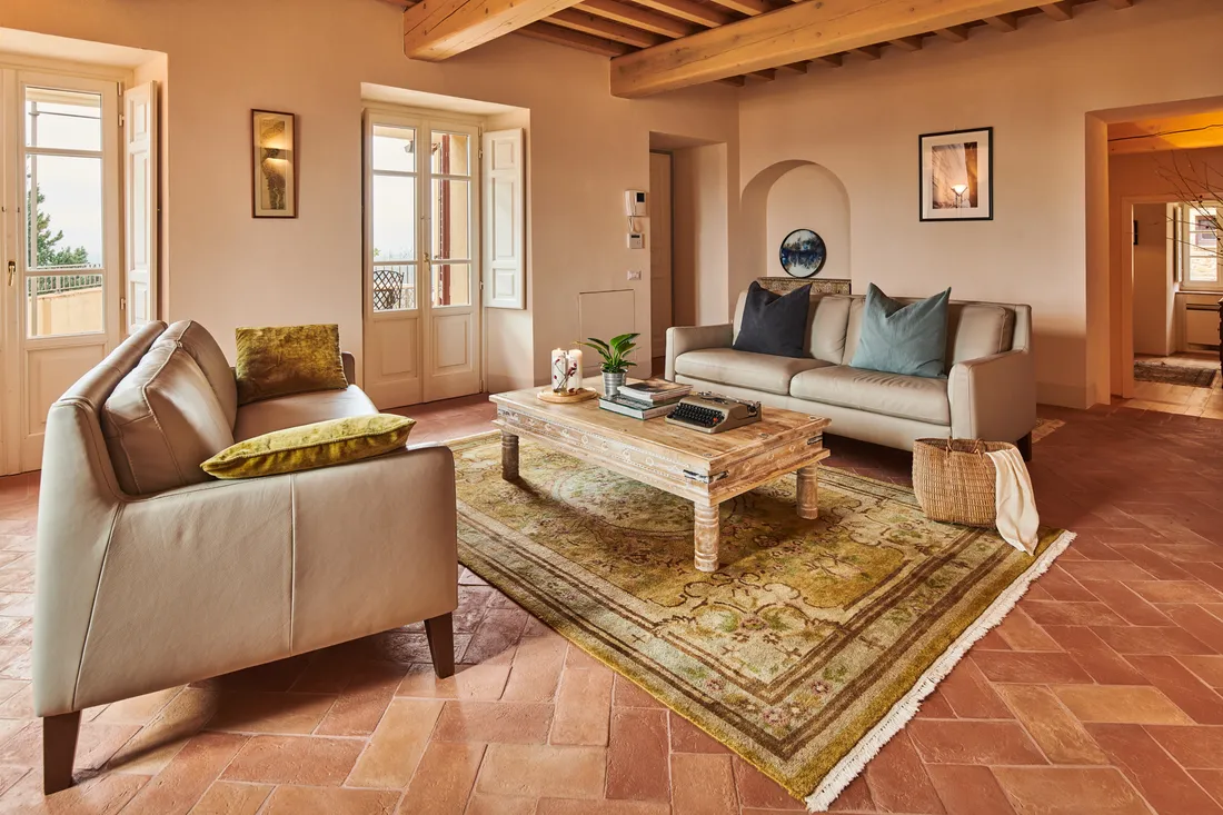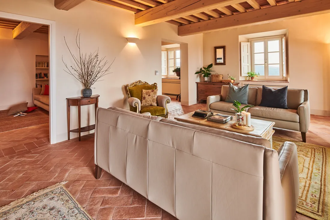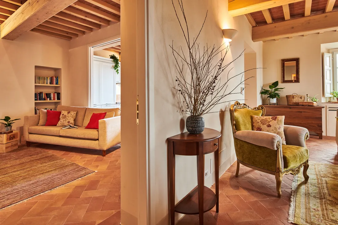 THE APARTMENTVia a beautiful outdoor staircase you reach this luxurious first floor apartment (120m²) with incredible views over the Tuscan hills.The entrance leads to the bright and spacious living/dining area with a direct entrance to the spacious, open kitchen. Right next to it is another room that can be used as a (sleeping) lounge and/or TV room. Access to the very large pergola terrace (25m²) which offers beautiful views over the Tuscan nature and the golf course. A small passage from the living room leads to the sleeping area where there are 2 bedrooms with bathrooms (one en-suite). From the apartment you can walk to the golf course in just 12 minutes or to one of the resort’s own restaurants (8 in total!) only few minutes away. You can use the pool landscape or the wellness area of the 5-star hotel against a fee. The apartment offers plenty of privacy and space for the whole family, including a further storage for up to four bicycles. LOCATIONLocated between Florence, Pisa and Siena, Castelfalfi is an 800 year old village set in 1100 hectares of charming, unspoilt countryside, about an hour from either Pisa or Florence airports. The small village center has been completely restored and offers all amenities. The apartment is on the 1st floor of one of the buildings of the Borgo di Castelfalfi. Within walking distance you will find 7 restaurants, various shops, a wellness center with 3 outdoor pools, a SPA center, a 5-star hotel and a golf course, where another restaurant is located.