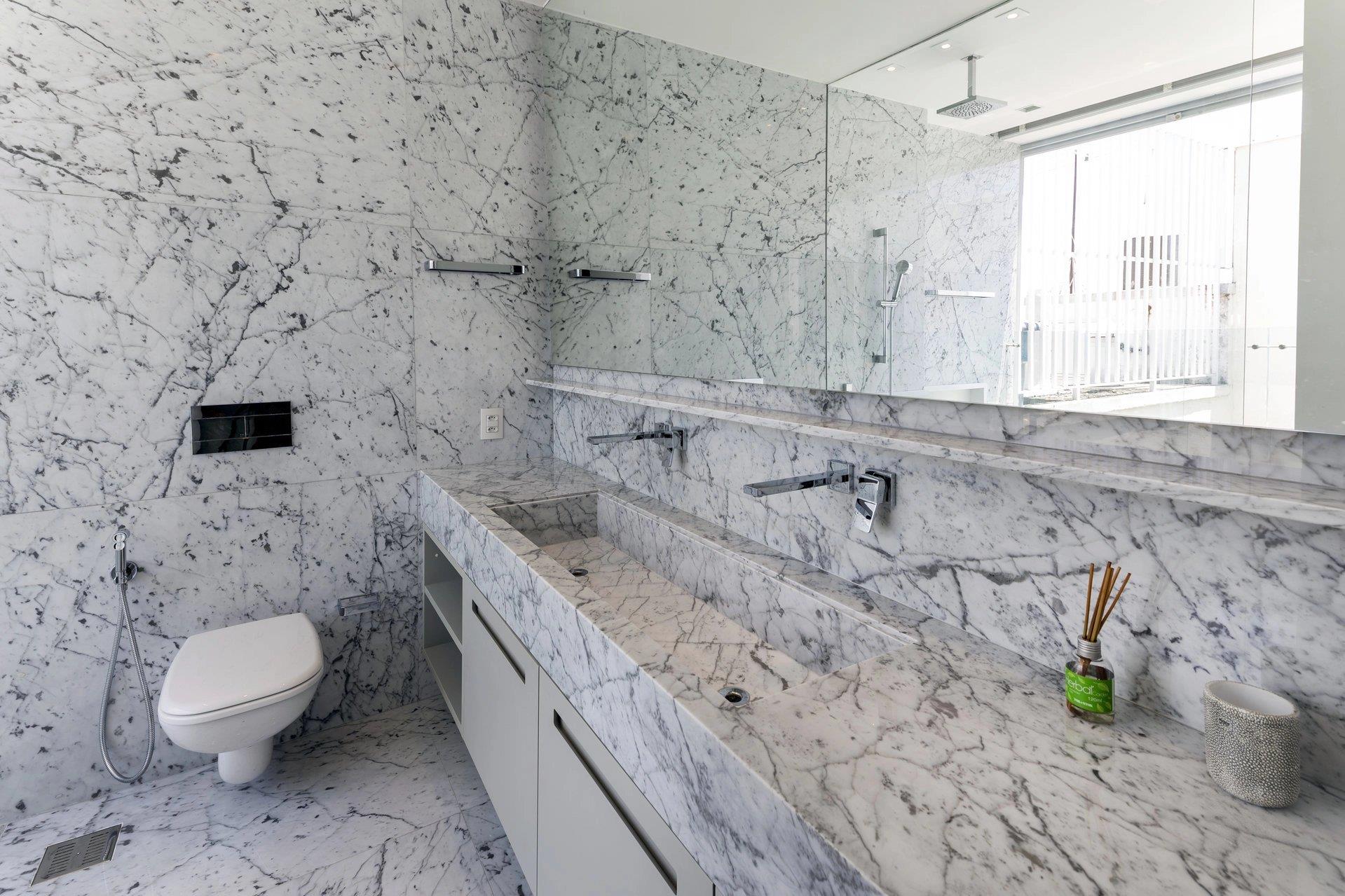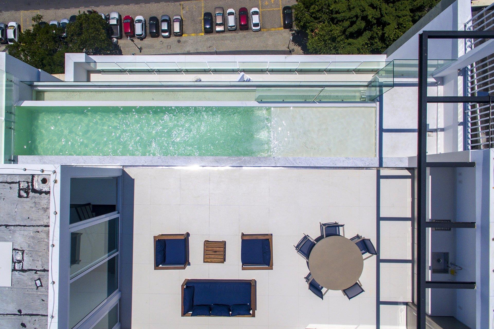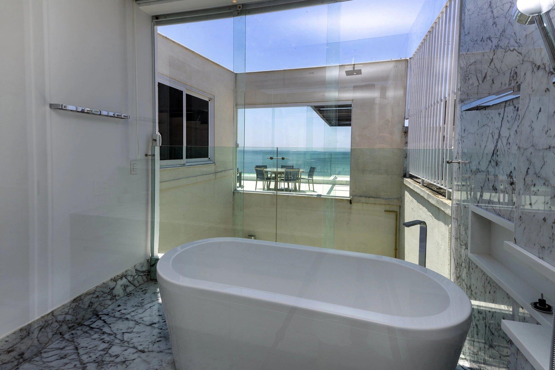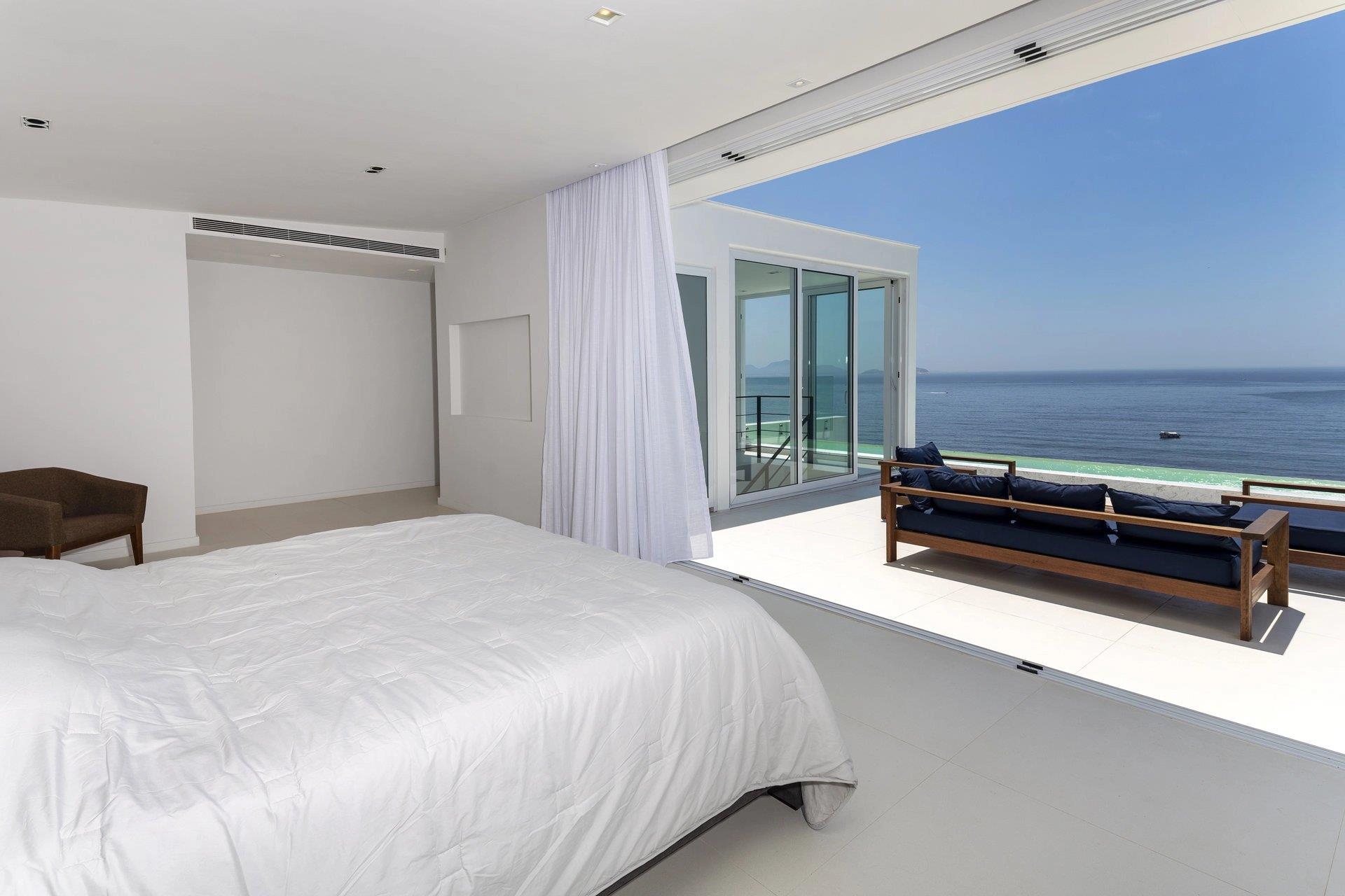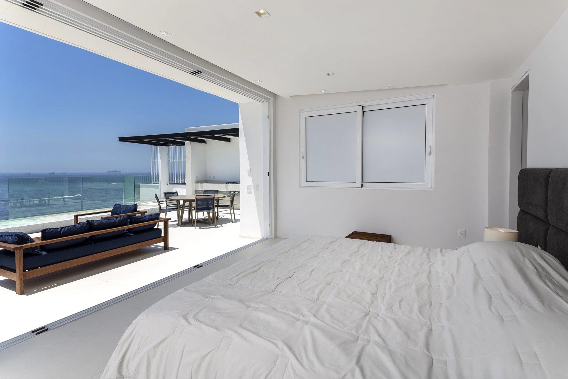 The true highlight of the property, the master suite boasts a bathroom with ocean views and opens onto a vast rooftop terrace. This outdoor space, complete with large lounge sofas and an infinity pool, offers an idyllic setting for unforgettable moments in the heart of Rio.