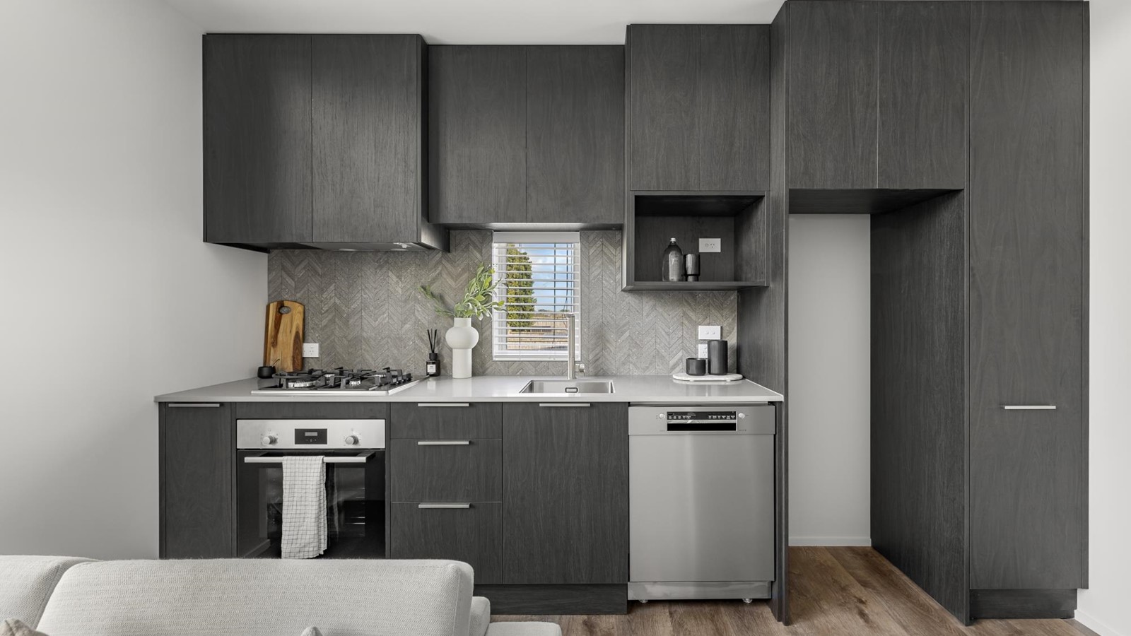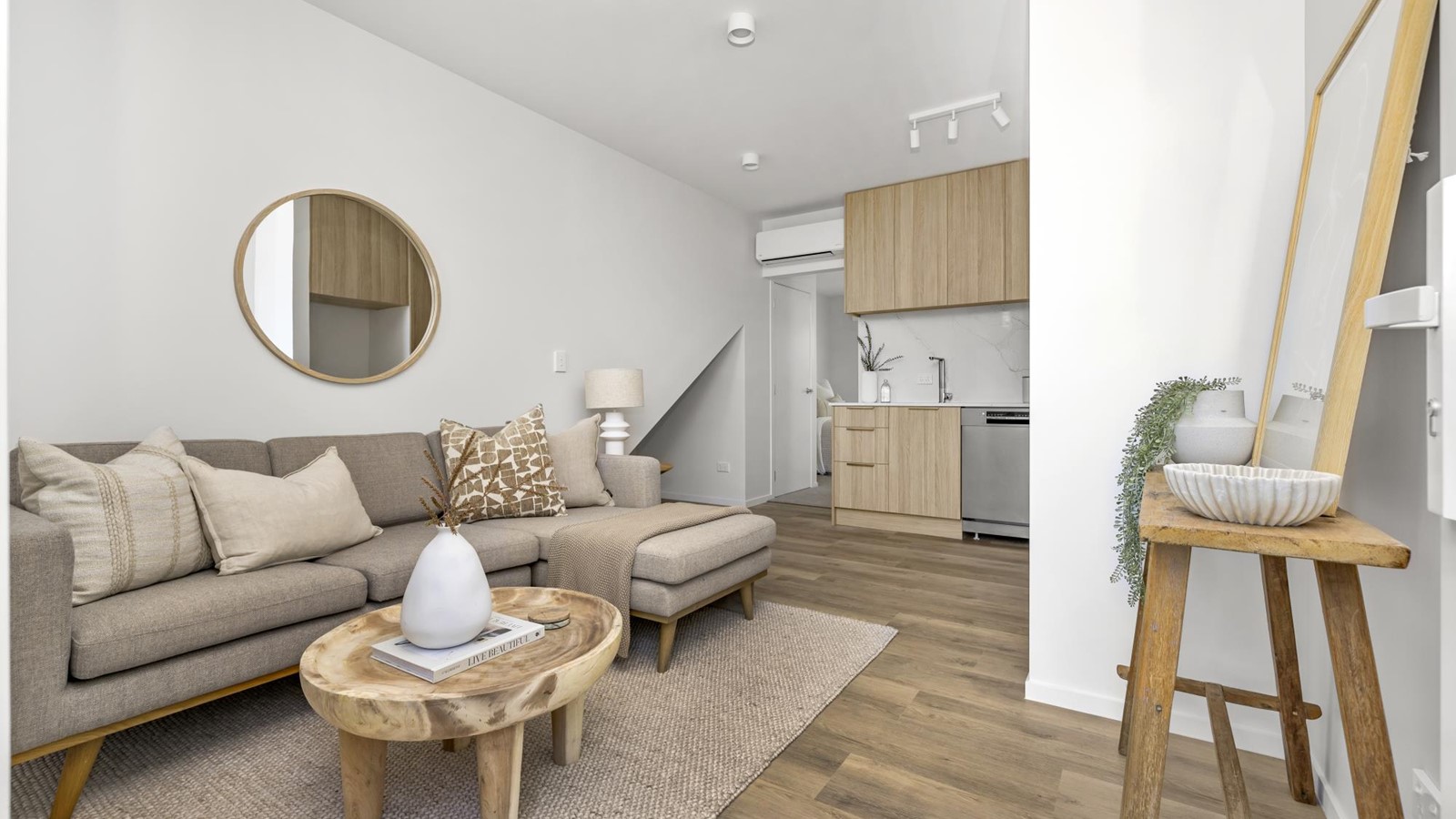 One option includes a private corner patio, an ideal spot to relax at the end of the day. Inside, the open-plan living area is light-filled and welcoming, complemented by a sleek, contemporary kitchen perfect for everyday use. The bedroom features a walk-in wardrobe, and the interior is finished in a calming, neutral palette that suits a wide range of tenants.