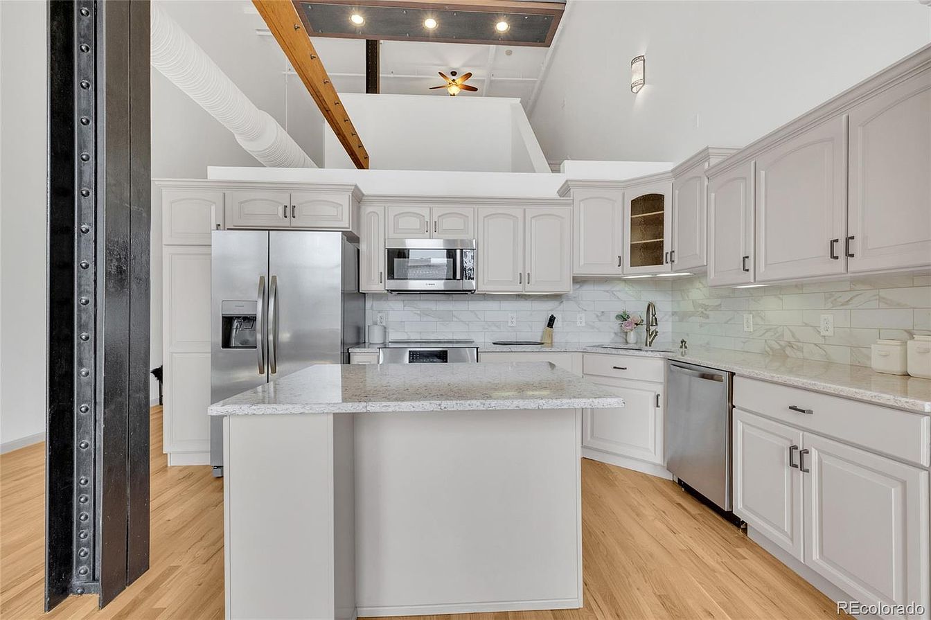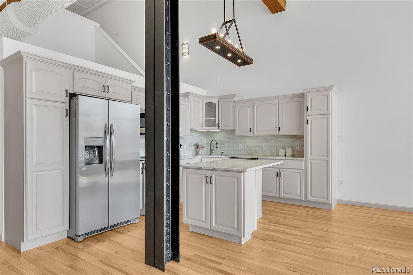 Soaring ceilings, exposed brick, oversized windows, and open-concept living blend historic character with contemporary style. The updated kitchen and baths make this home truly move-in ready, while the primary suite includes an oversized custom-built closet and en-suite bath for convenience.