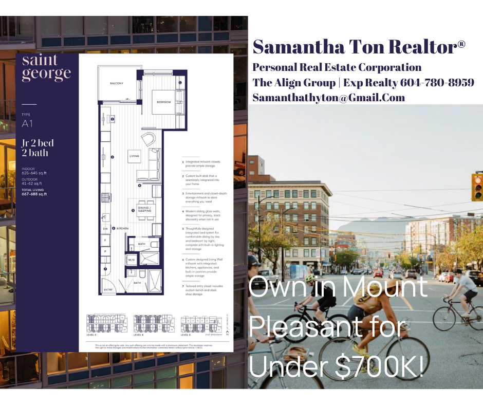Assignment opportunity in vibrant Mount Pleasant! The Saint George. This top-floor, south-facing Jr. 2 Bed + 2 Bath home offers a smart, functional layout with built-in desk, integrated bed, and sliding glass wall. Approx. 688 sq ft total with locker included. Boutique low-rise building completing summer 2025. Perfect for professionals or investors looking for a modern home in a walkable, transit-friendly neighbourhood. Steps to shops, cafes, breweries, and future Broadway SkyTrain. Priced at $688,000—below market value. 1 Storage Locker included. Assignment of contract. Contact listing agent for details. Parking is available for purchase upon request.