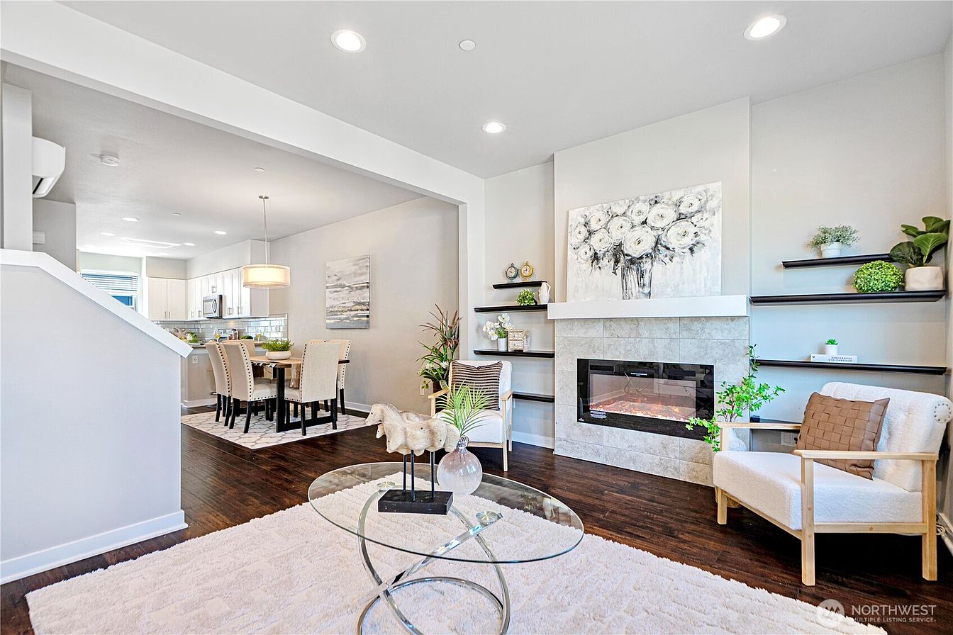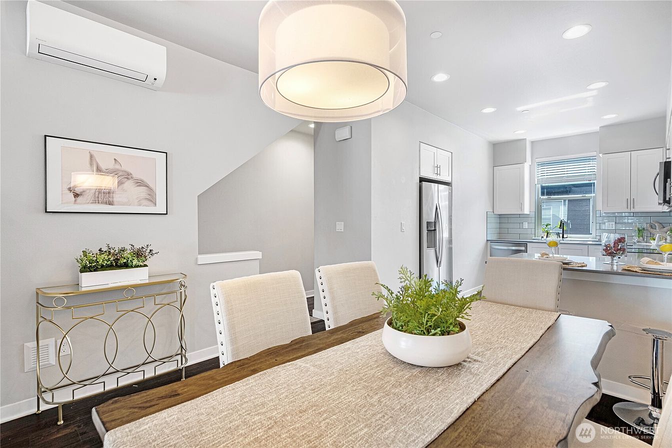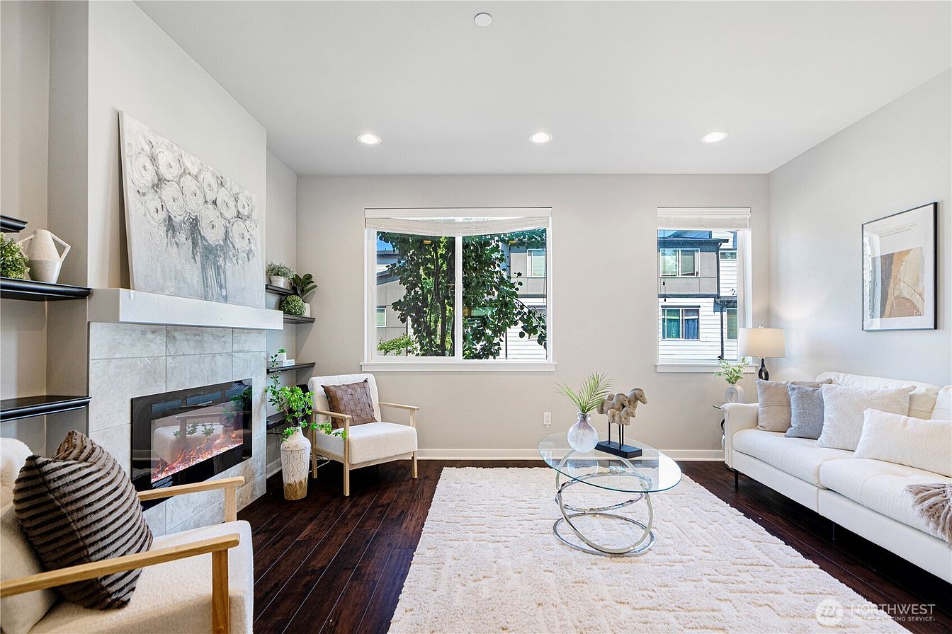 Beautiful townhome at 38 Lundin Community featuring quartz countertops, white shaker cabinets, full-height backsplash, and soft-close drawers. The living room offers a modern fireplace with designer accent wall and contemporary mantel, plus main floor ductless A/C system included for year-round comfort. Upstairs you’ll find two spacious master suites, each with a private bath, providing style and functionality. Tandem garage fits 2 cars with room for storage, bikes, or hobby space. Prime location with easy 405 access—walk to coffee, groceries, parks, and dining just minutes away. No rental cap—ideal for investment, long-term growth, or personal retreat. It is where location, lifestyle, and value meet!