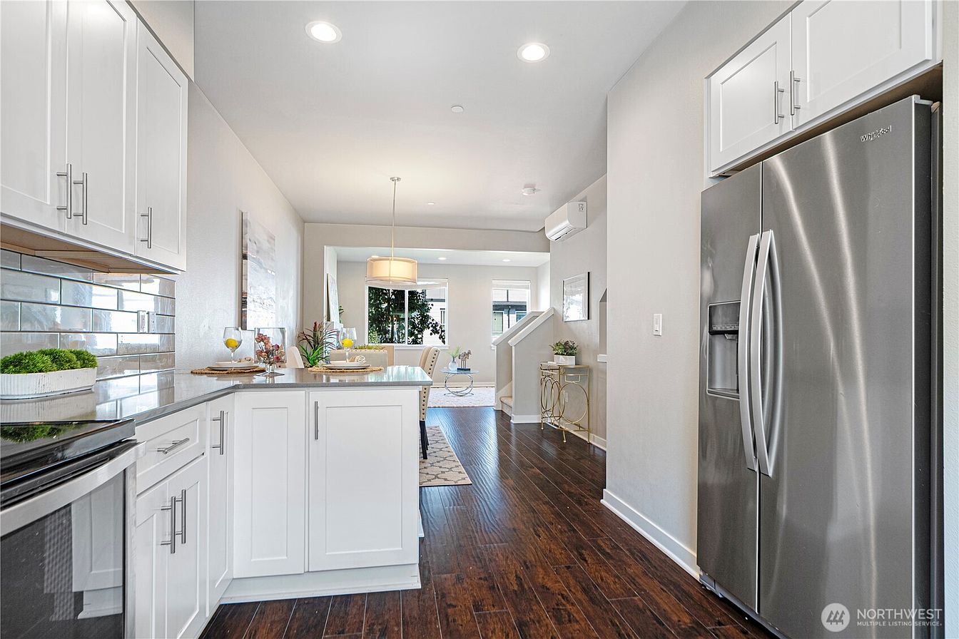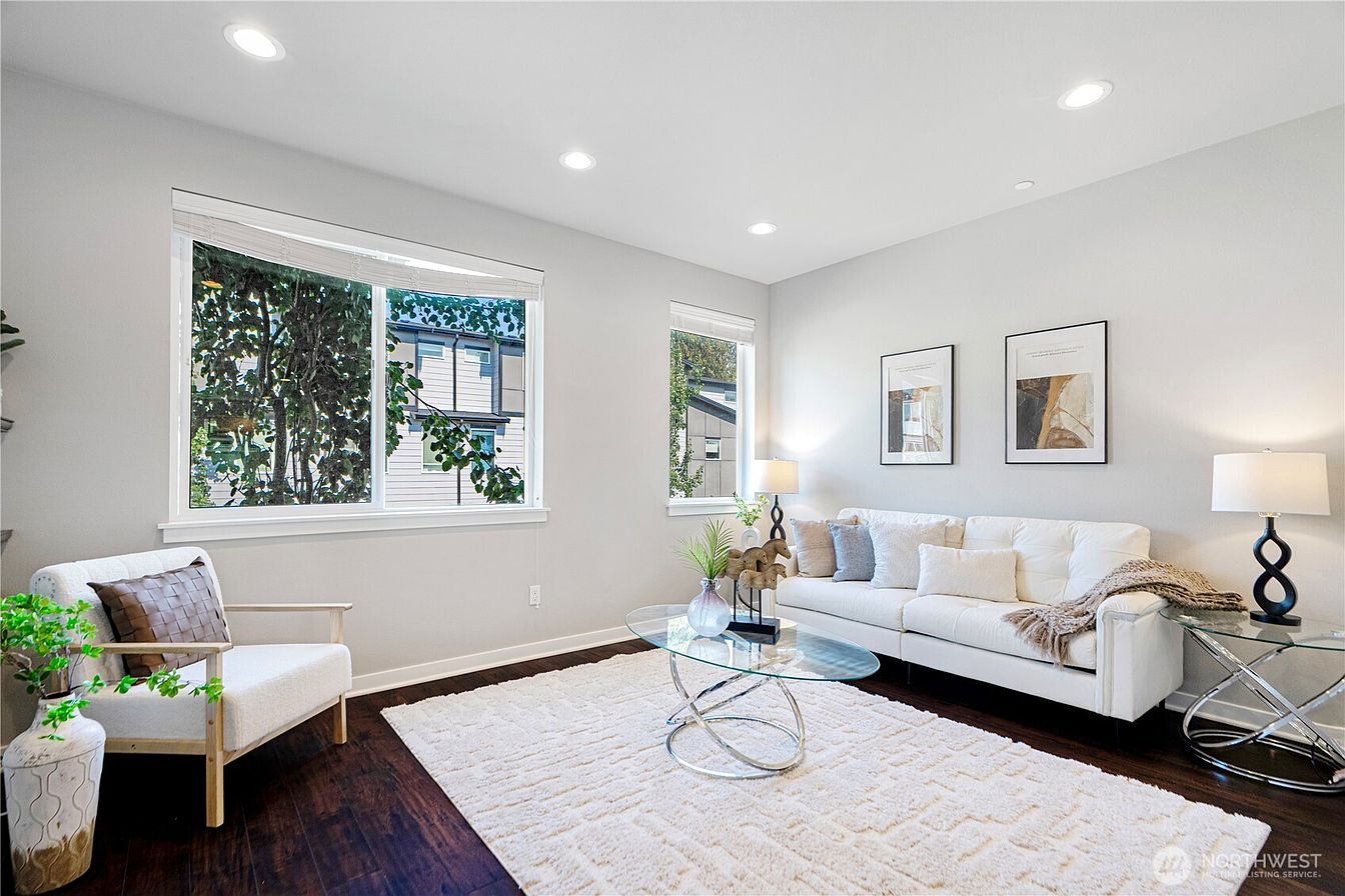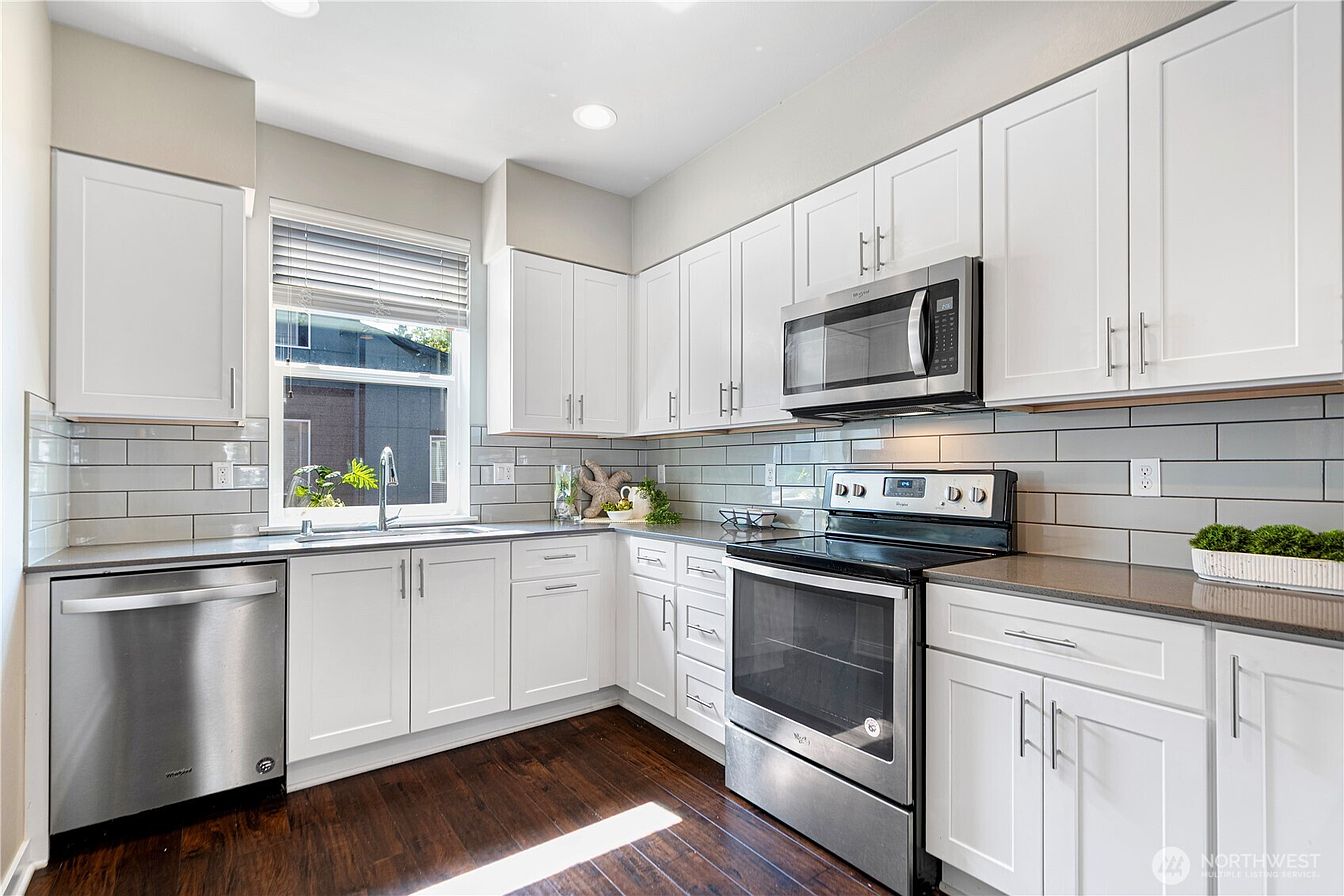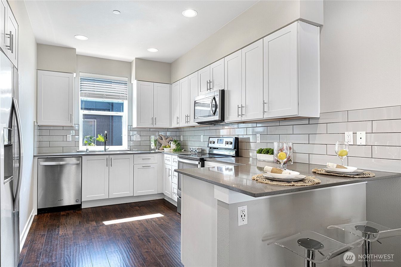 Beautiful townhome at 38 Lundin Community featuring quartz countertops, white shaker cabinets, full-height backsplash, and soft-close drawers. The living room offers a modern fireplace with designer accent wall and contemporary mantel, plus main floor ductless A/C system included for year-round comfort. Upstairs you’ll find two spacious master suites, each with a private bath, providing style and functionality. Tandem garage fits 2 cars with room for storage, bikes, or hobby space. Prime location with easy 405 access—walk to coffee, groceries, parks, and dining just minutes away. No rental cap—ideal for investment, long-term growth, or personal retreat. It is where location, lifestyle, and value meet!