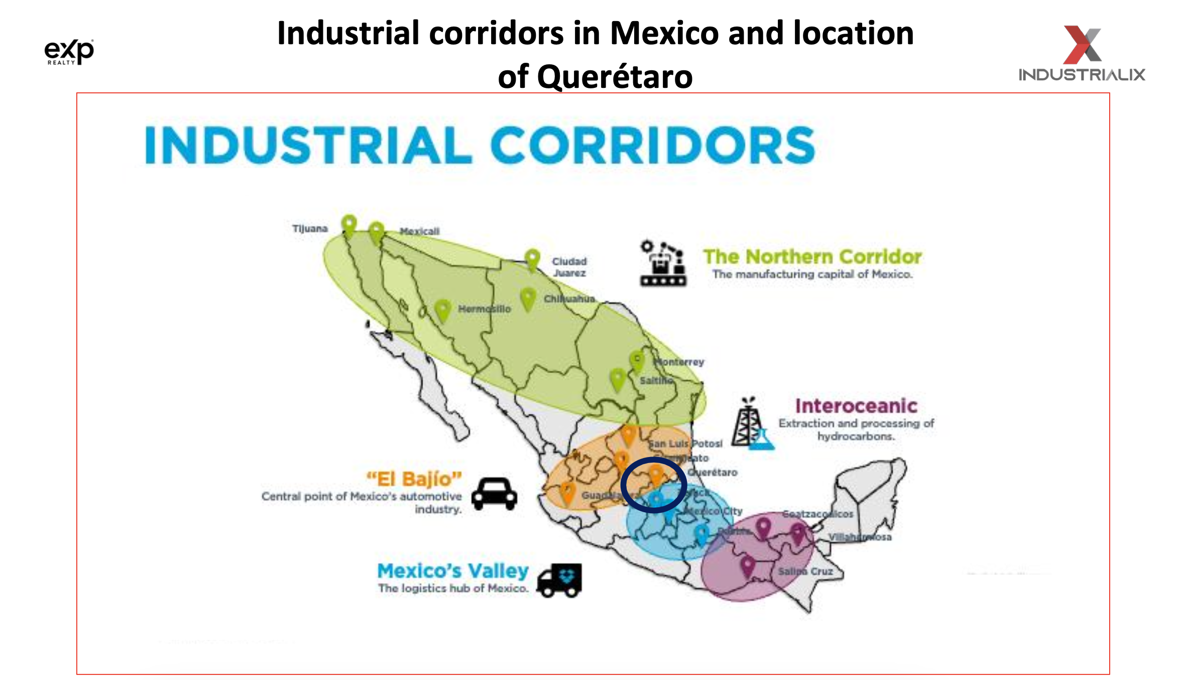 Industrialix , 85 hectares of industrial land ( all of partial land sale ) , located in "El Bajio", central Mexico, surrounded by Industrial parks, automotive industry ( Toyota plant is only 15 minutes away ), Regional airport, highways and railroads that connect Mexican exports to the US market .