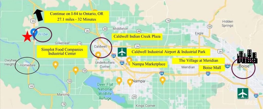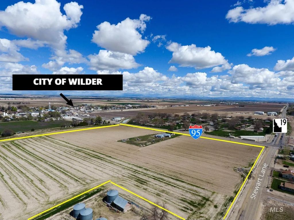 3 Separate parcels totaling 38.89 Acres. FANTASTIC DEVELOPMENT OPPORTUNITY at the intersection of two major Idaho Highways 19 & 95. Currently in the county, the City of Wilder impact area, and zoned AG. Comp plan indicates Commercial zoning on Hwy 95 frontage with R1 (Low Density Residential) on remaining acreage. Possibility of a Mixed Use zoning. 3 separate parcels give opportunity for lot line adjustments for future parcel reconfiguration. City sewer and water are in the streets adjacent to property.