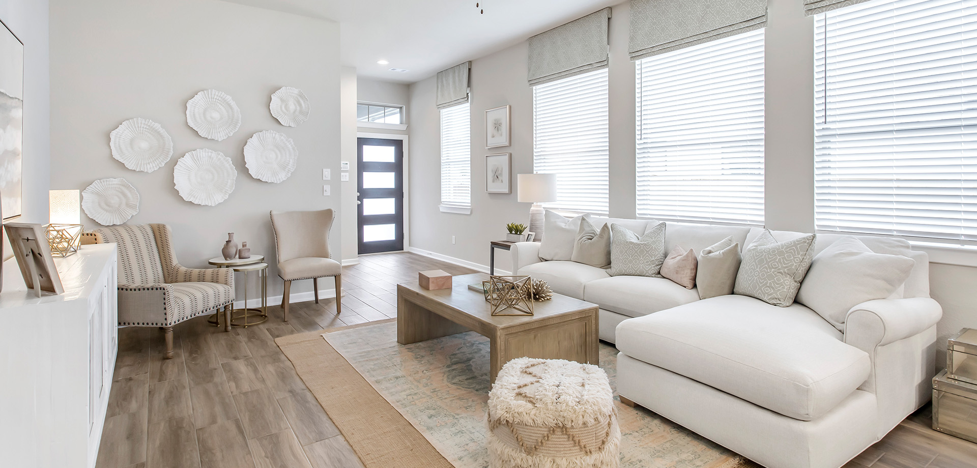Plan #4582 | Single-story | 3 bedrooms | 2 baths | 2-car attached garage | Large tandem family room, kitchen, and casual dining area with access to covered patio. The kitchen has central service island with countertop dining. The private main suite features a private bath with dual sinks and a garden tub with a separate shower. Option available to upgrade to larger shower without tub.
