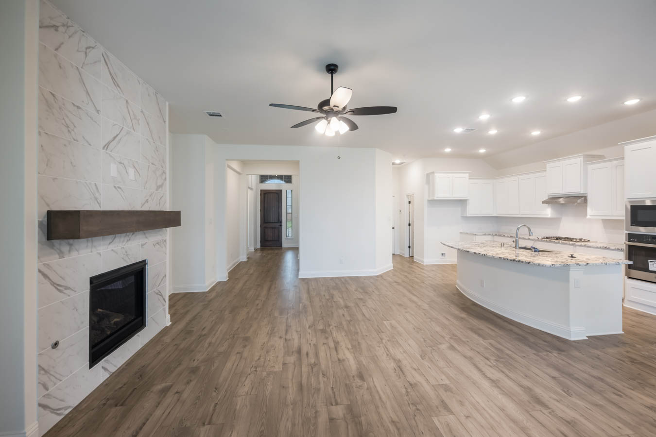 The Bridgeport is a beautiful one-story home that features three bedrooms, a study, two baths, a covered patio, and a two-car garage. Gather with friends and family in the living room where you will enjoy the fireplace during the cooler months. The kitchen features a granite island and a breakfast area, with a large pantry.