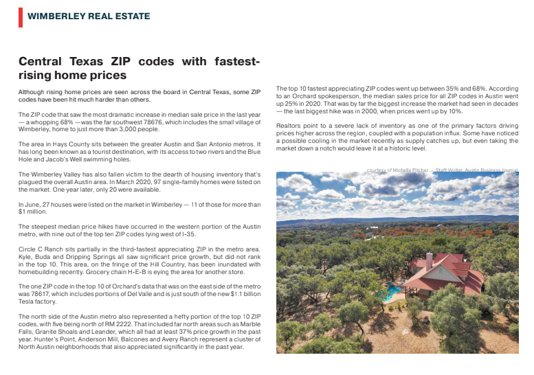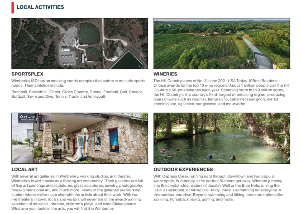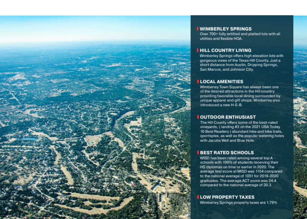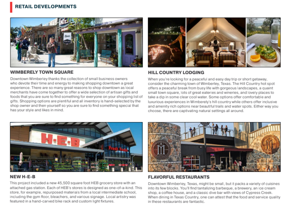 Why Wimberley?: Wimberley is poised for growth as Texas continues to attract new residents and businesses. This community offers developers a chance to build in a high-demand market with significant upside potential while enjoying the support of a local government eager to encourage development.